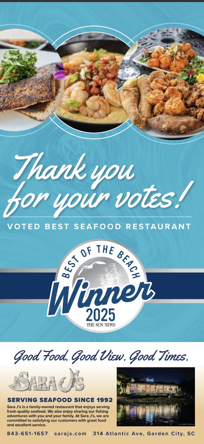 BEST OF THE BEACH 2025 !! WE'RE HONORED THAT SARA J'S WAS VOTED BEST SEAFOOD RESTAURANT IN 2023 AND PROUD TO BE RECOGNIZED AGAIN IN 2025. THANK YOU TO ALL OUR AMAZING GUESTS FOR YOUR CONTINUED SUPPORT!