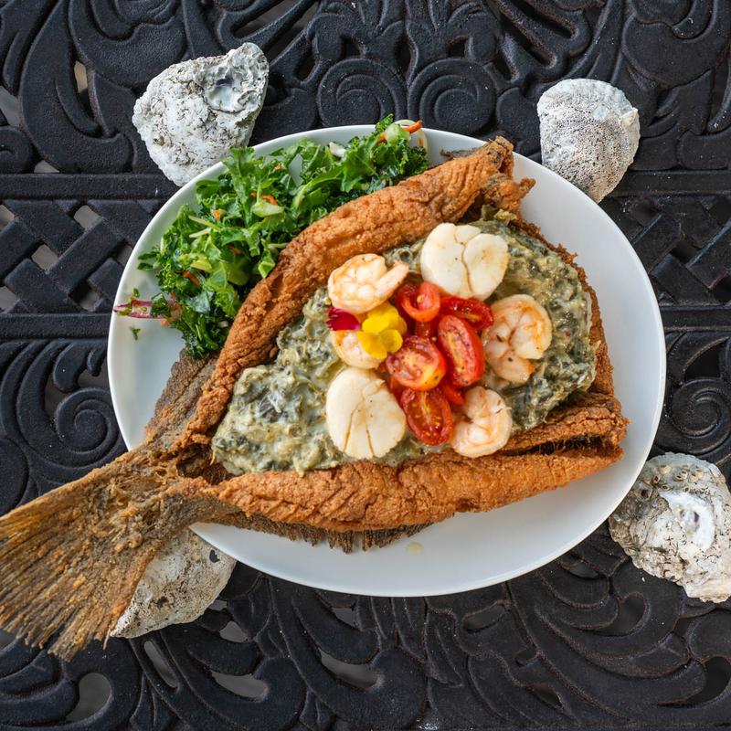 The entire place and the staff extremely nice and helpful, the waiters were really good on telling me what is good and giving full advice on the best choices in the menu. Sitting outside was so beautiful watching the marsh and the gorgeous moon during sunset time. I ordered stuffed fish which was whole grilled red snapper fish on top of crab cakes with steamed vegetables, that was delicious and super filling.